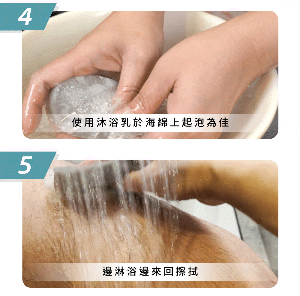 3.一邊淋浴一邊使用起泡的竹炭纖維海棉擦拭乾淨(請勿過於用力,或是來回重複一個範圍狂擦,肌膚會受傷的唷!)