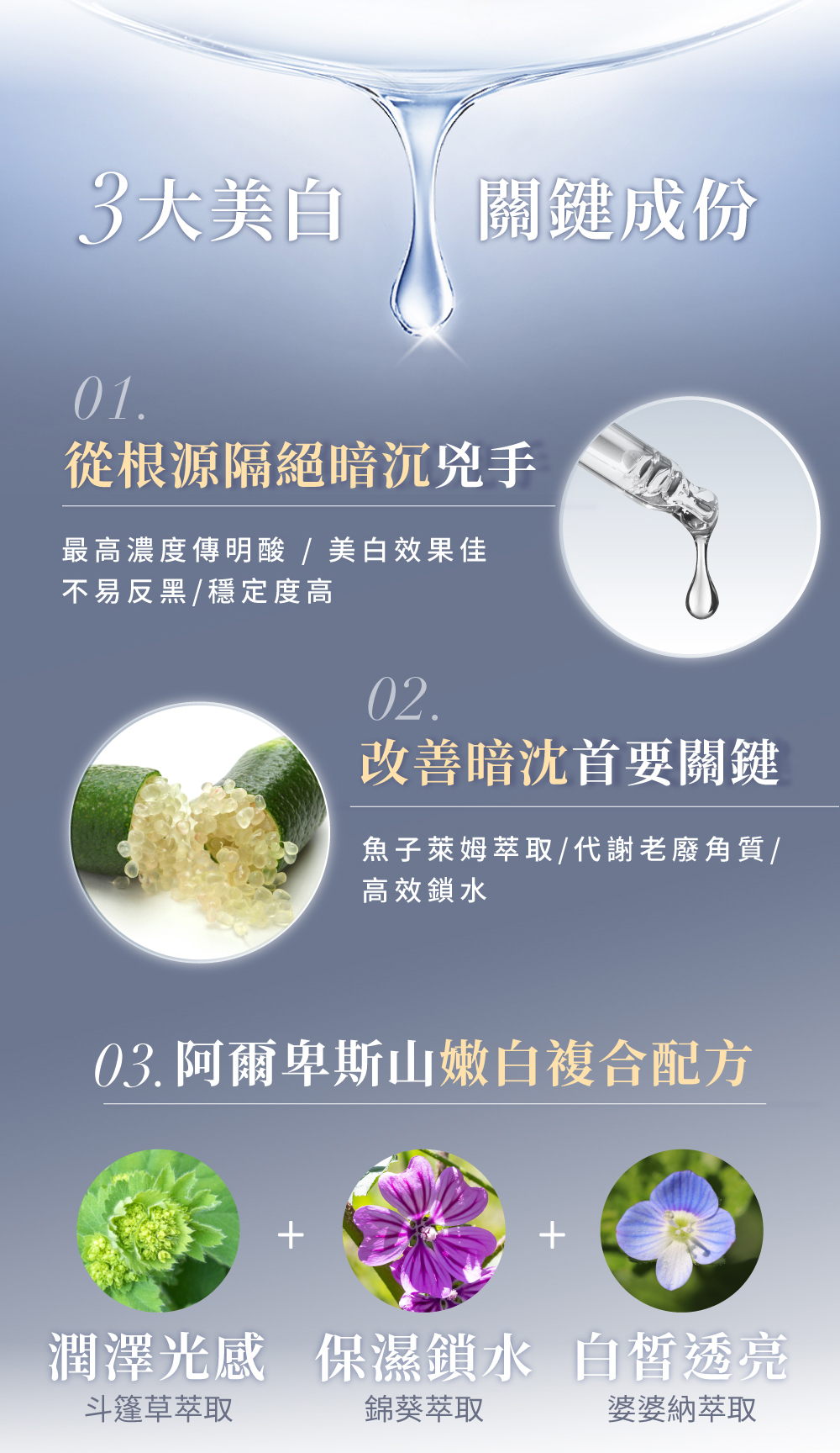 成分:傳明酸、阿爾卑斯山美白複合因子、錦葵萃取、薄荷萃取、歐洲櫻草萃取、婆婆納粹取、香蜂花萃取、魚子萊姆萃取物、尿囊素、海藻糖