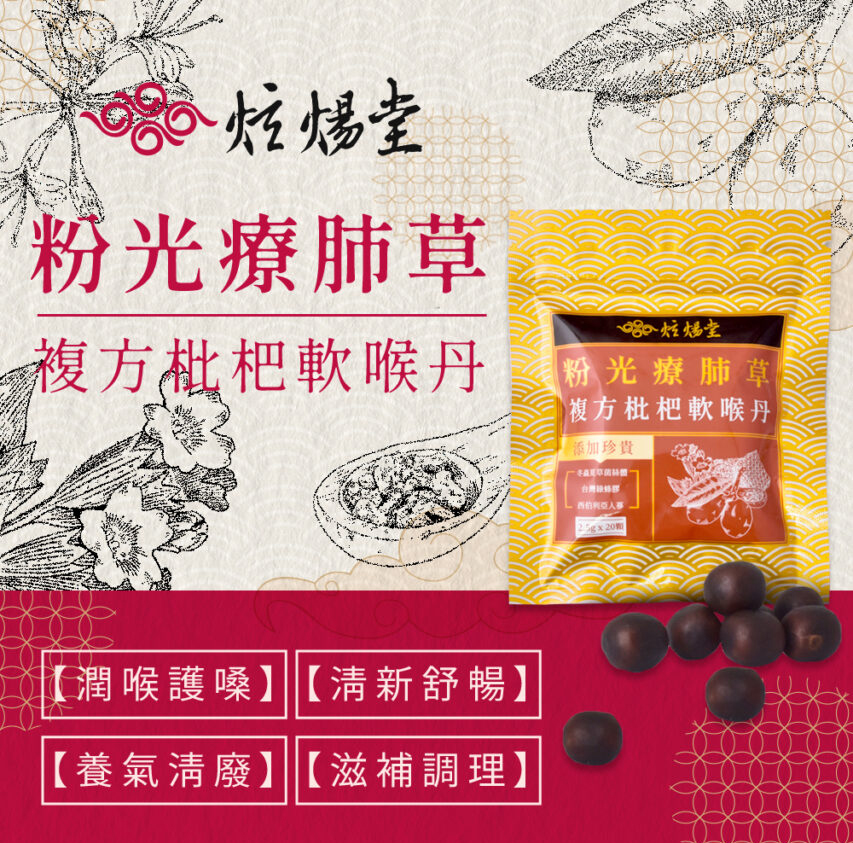 成分:砂糖、麥芽糖、椰子油、阿拉伯膠、植物萃取物(枇杷葉、桔梗、茯苓、陳皮、蓮子、羅漢果、生薑)、蜂蜜、薄荷、香料、焦糖色素、粉光(花旗蔘)、療肺草、西伯利亞人蔘、蜂膠(含11%黃酮)、金銀花萃取物、冬蟲夏草菌絲體(蝙蝠蛾擬青徵菌絲體粉末)(含15%多醣體)、棕櫚蠟(食品製造用劑)