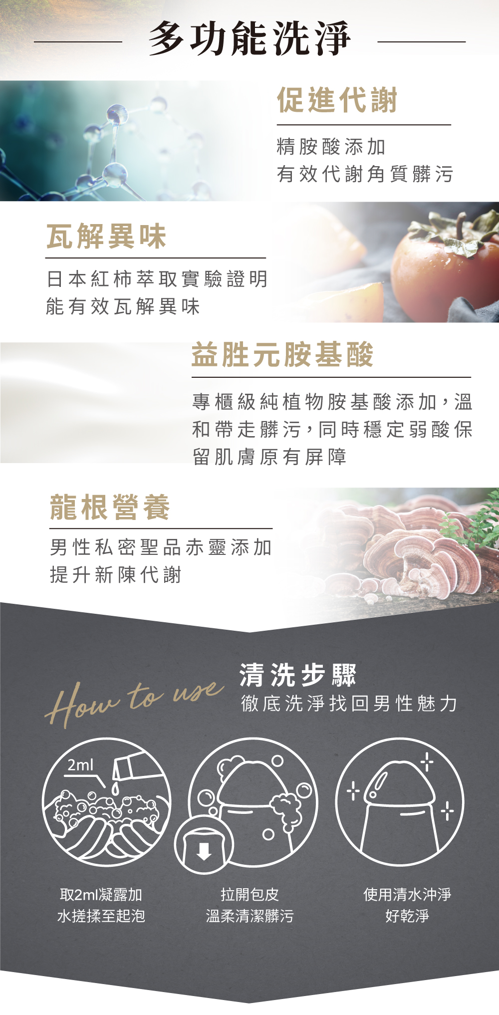 成分:Water,Sodium Laureth Sulfate(溫和高等級胺基酸洗淨),Decyl Glucosidem,Cocamidopropyl Betaine,Propanediol,TEA Cocoyl Glutamate(椰油萃取高等級胺基酸有效潔淨),Acrylates Copolymer,PPG-26-Buteth-26,PEG-40 Hydrogenated Castor Oil,Arginine,Phenoxyethanol,Fragrance,Chlorphenesin,Menthol,Ganoderma Lucidum Extract(赤芝萃取),Persimmon Extract(日本進口紅柿萃取有效去味),Xanthan Gum,1,2-Hexanediol, Caprylyl Glycol,Vanillyl Butyl Ether,Hexamidine Diisethionate