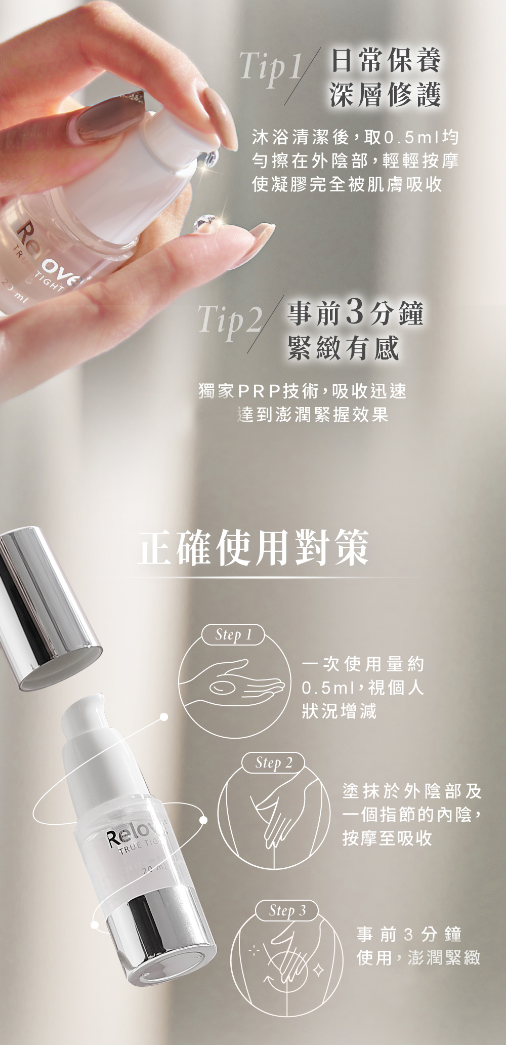 建議沐浴清潔後,取0.5ml均勻擦在外陰部,輕輕按摩,使凝膠完全被肌膚吸收,視個人情況,可酌量增加用量,恩愛前三分鐘輕輕按摩效果更佳。